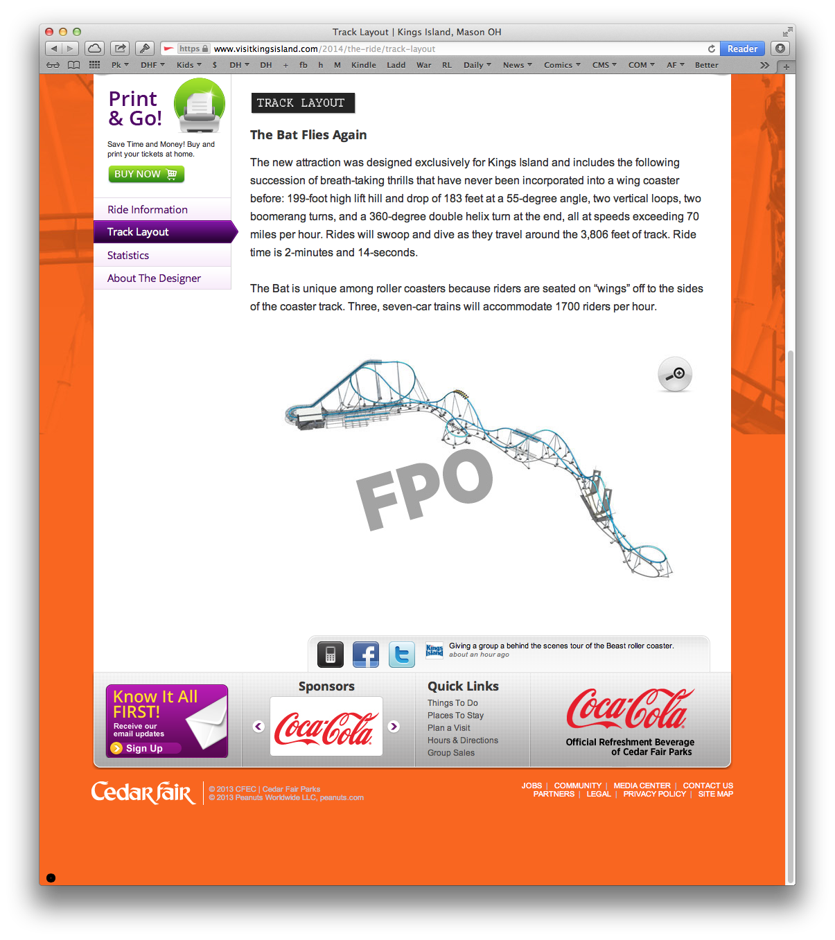 I think it's fake, there was for a short time on the Kings Island website was hacked or cedar fair purposely created the url prior to banshee with KingsIsland.com/thebat. It had a picture of a wing coaster. It too was pulled a day later. Either it a hacker, or Cedar Fair like to mess with us. Since we are so clever. It makes me think Intimidator is converting to Centurion and The new coaster???? Check out the bat screen below. The initial clues pointed to a roman theme,The Roman Colosseum is a wonder of the world, but they were referencing the Charlotte Colosseum. They said in a facebook clue "we can't call it the Charlotte Colosseum" I see a flowing pattern here, the hornets play there, the bee keeper suit, but nets, and the possible green track in Ohio.