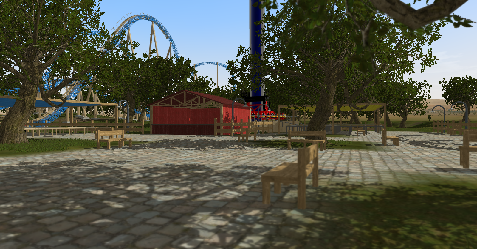 The area is almost complete. I added a building that could serve as a food stand or another park building.