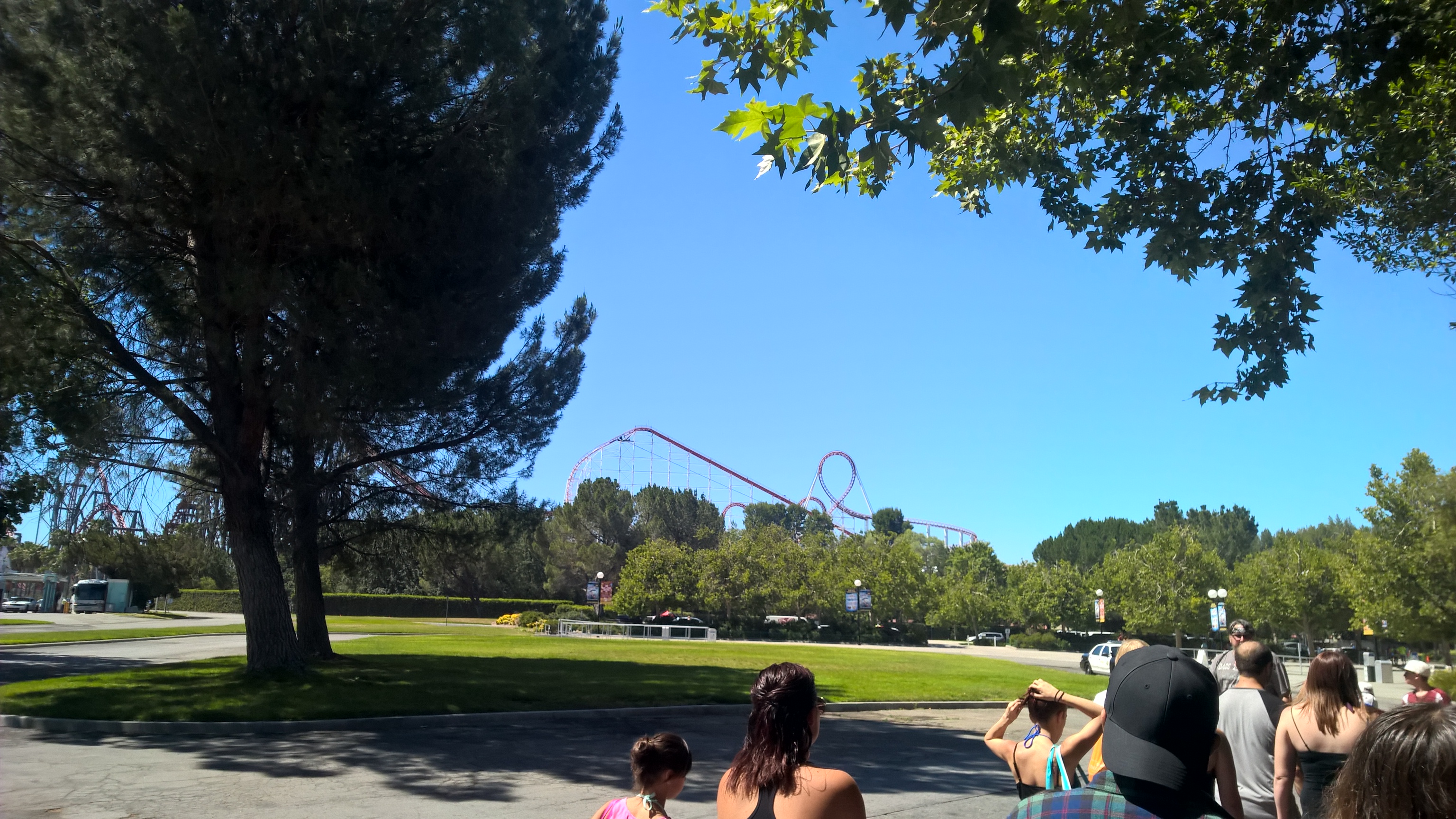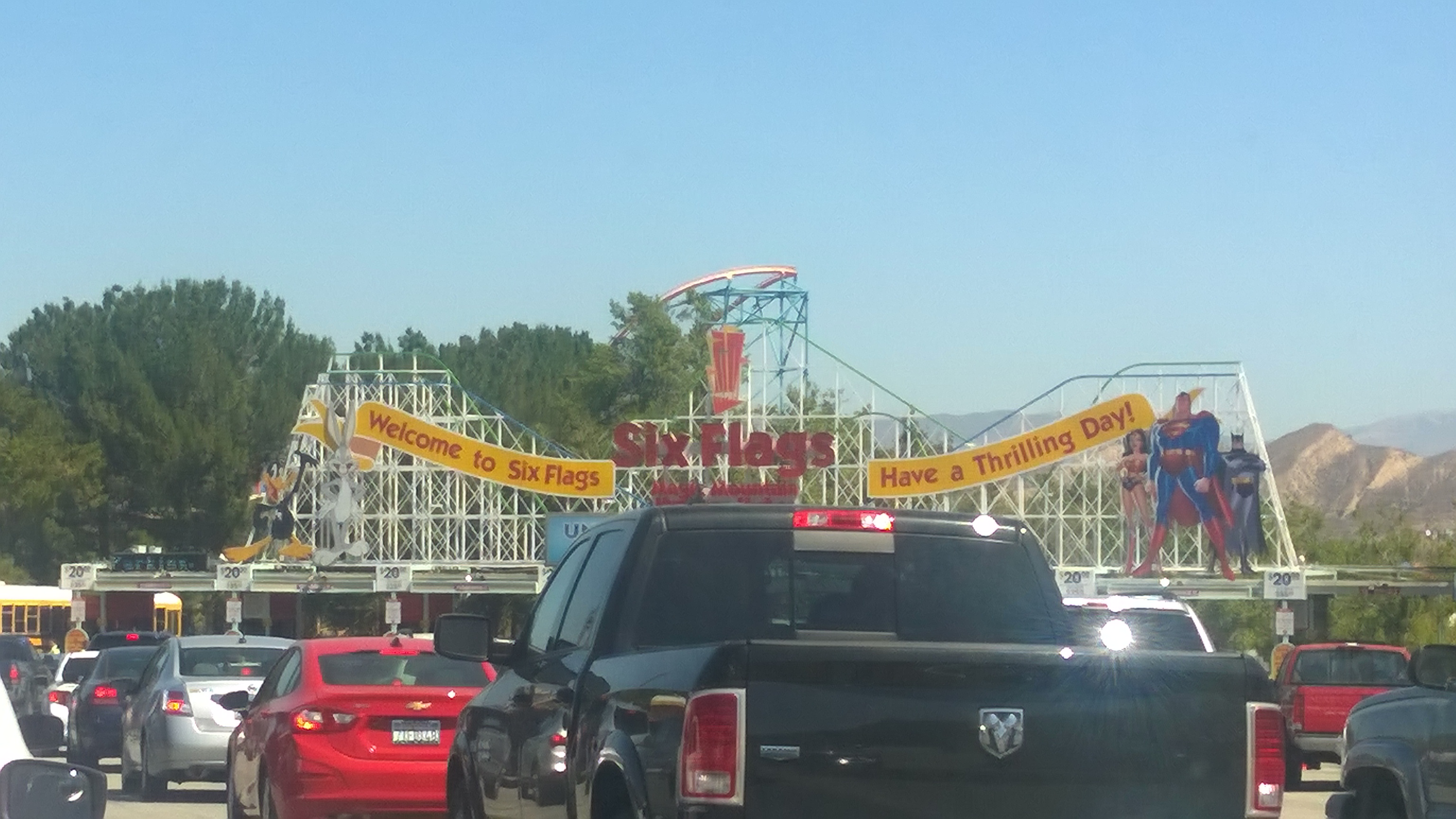 We got to the parking lot booths and were pleased to see that there was not a long line of cars to get in. We ended up with a pretty decent parking spot, perfect for some coaster close-ups.