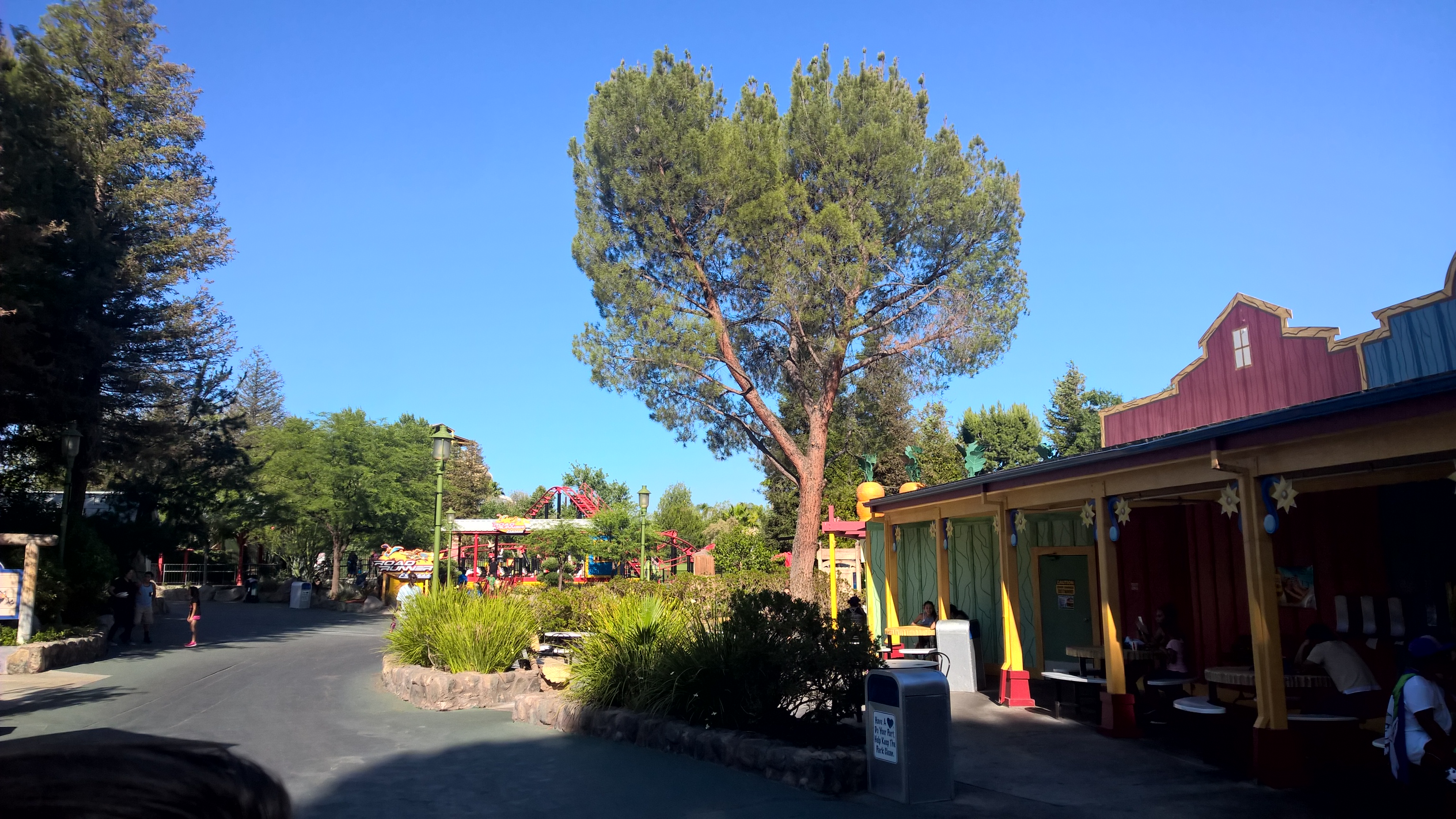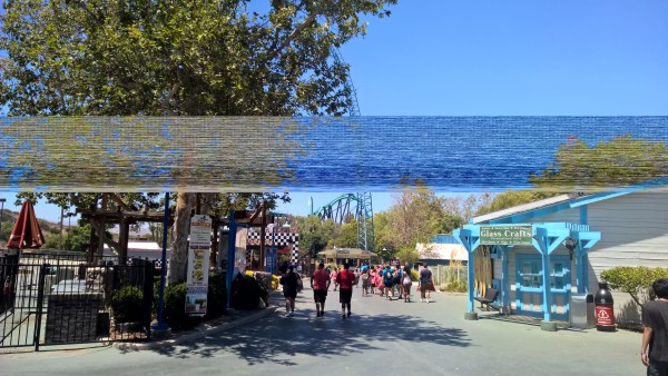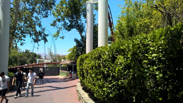 We headed to the gates and were pleased to see that there were no massive crowds trying to get in, or crowding pathways throughout the park. This was not a good day to be fighting crowds, the heat was enough of a challenge to overcome. Luckily, the crowd level was definitely manageable. We exchanged our vouchers for the actual pass and proceeded into the entry gates. I was pleasantly surprised that the park seems to be getting cleaner, and the view of the rides from the front of the park was stunning, all the rides were shining brightly in the blistering So Cal sun.