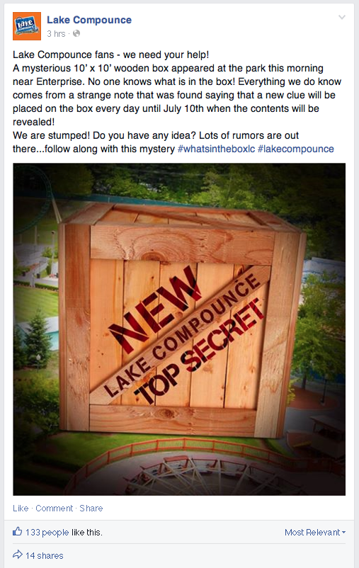 It looks like Lake Compounce has started teasing their 2016 attraction with this Facebook post. At this point, it's hard to tell what it could be. It would be nice if it's a new roller coaster since it has been 15 years since Boulder Dash was added.