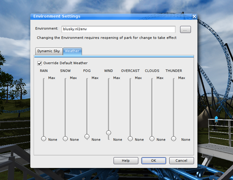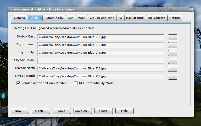 All of these changes were created in a custom environment, which can be created under the Advanced ---> Environment Editor tabs. I called this one "blusky" because it is a cloudy blue sky, but I forgot the 'e' when I had saved it.