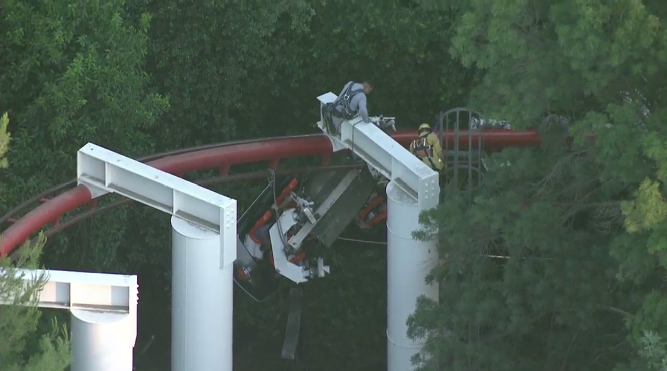Multiple cars holding riders appeared to be stuck at an angle in an area where the tracks pass under trees, aerial video from the scene showed.