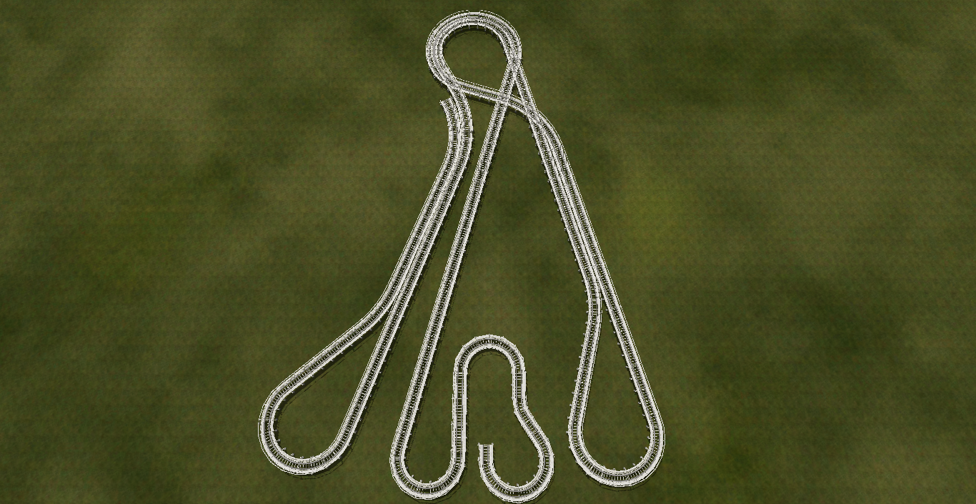 I had a crack at the horseshoe fan turn of TA1 today. This was mostly an experiment to test out some ideas for placement of segments making the curve and setting the heights of the crucial points without distorting the curve. I messed up and deleted a few nodes I shouldn't have, but I know how to get it right next time. You can see in the screenshot it's not exactly the most graceful of curves. Max speed was 40 mph, and the slowest speed around the fan turn was 17.6 mph.