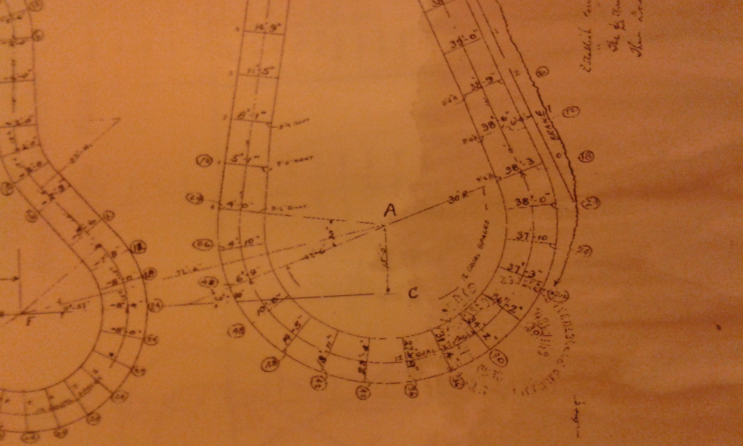 Attached is a bad photograph of the high front turn (TA2) section of the Riverview Bobs blueprint. As you can see, all along the curve of the turn are height marks where the bents go. The figures in circles are the degrees of banking, and the radius is marked as 30'. In order to create an accurate turn in FVD++ I need to be able to specify the radius, the length of track and the height and bank angles at the start and end. That would enable me to create the turn in stages. The other problem I'm having is with the straight sections where it seems the only thing I can tell it is how long it should be, but not the start or finishing heights. Am I trying to do the impossible? Is there a better way? :?: