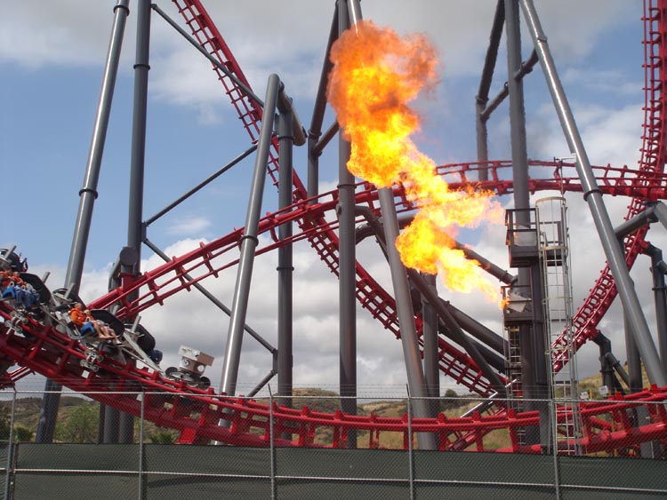 Don't worry, Six Flags Magic Mountain has some ideas on how to heat things up! (Yes, that is a train emerging from the fireball!)