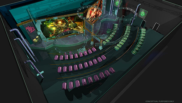 - 68 motion-based seats equipped with hand-held laser devices