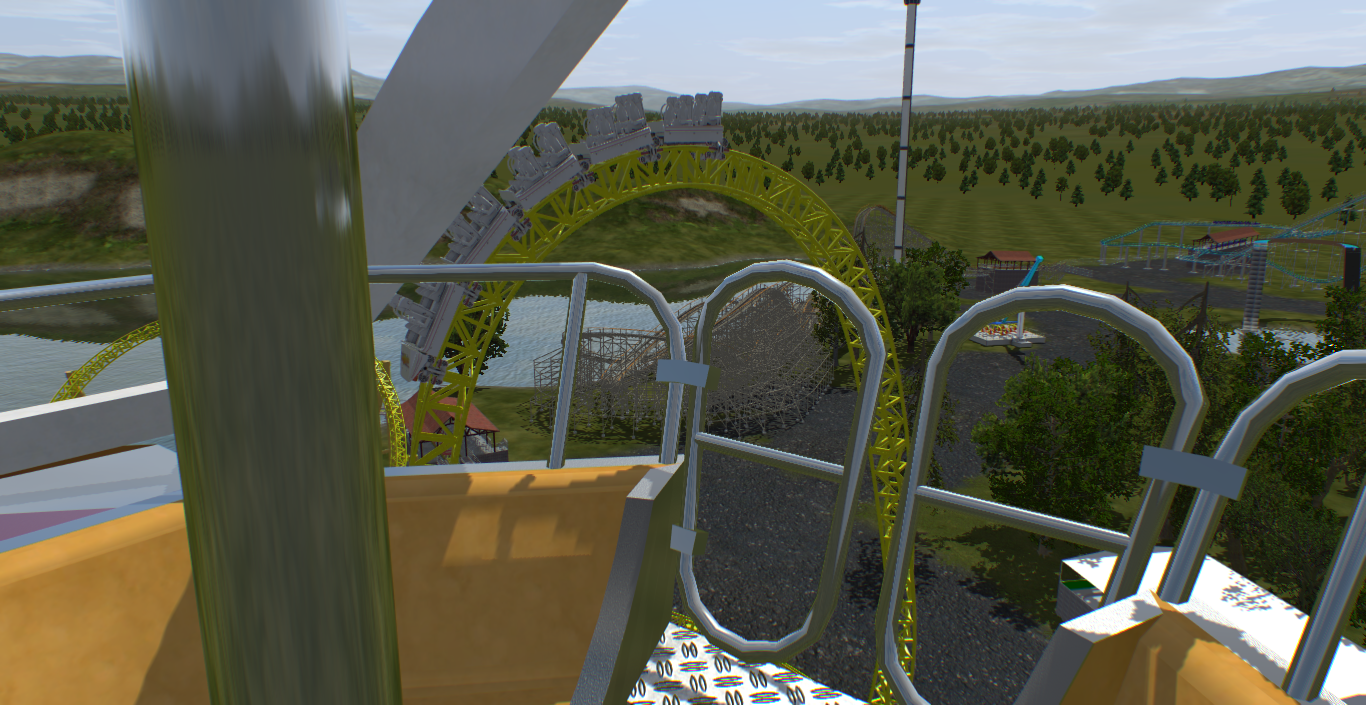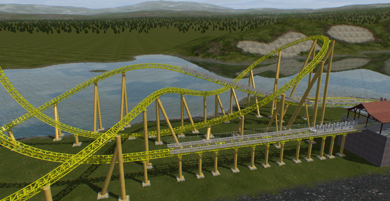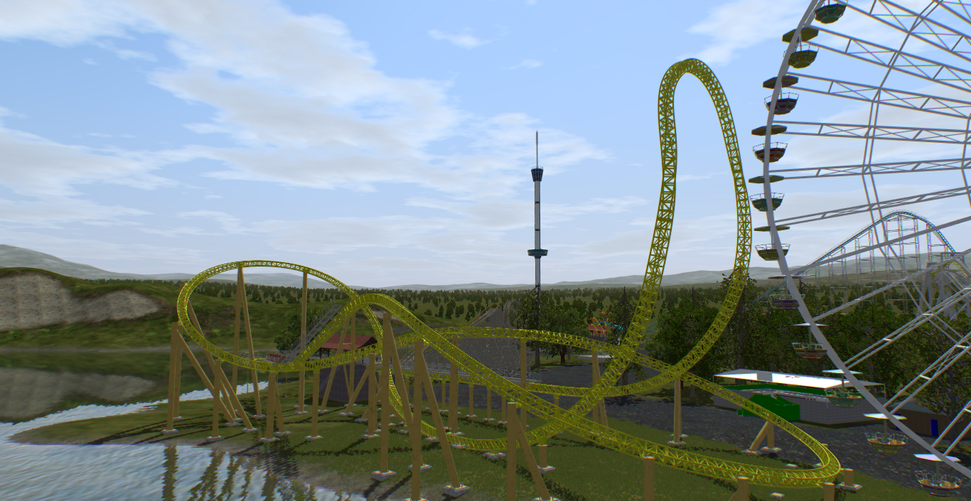 The Intamin I showed on the "What are you doing in NL2" thread has found a home in my lakeside park. Because the ride is so short it has been fairly easy to support and the only major part is the top hat, which I am still messing with the shaping a little bit, I am happy with where it is at for now though. I'm still deciding with colors, but I was considering the name "Bolt" so I thought the yellow appropriate. I think the Intamin fits in well with the park because at 150 feet tall it is the 2nd tallest coaster in the park, and most are generally short rides with the morgan hyper being the exception.